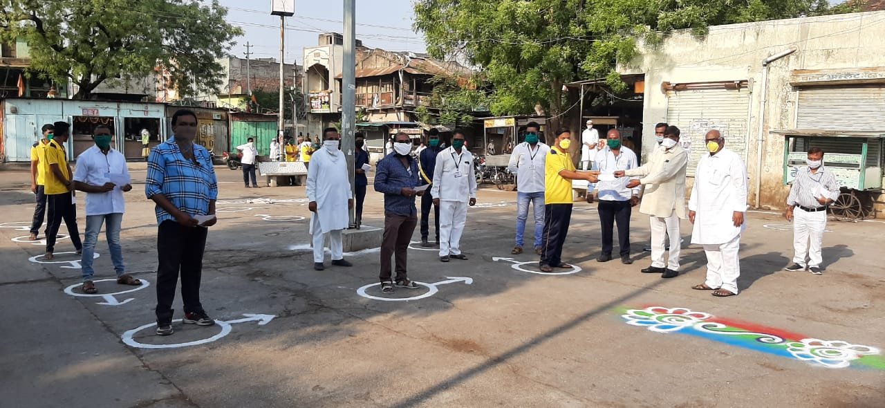 याकरीता नगरपरिषदेचे एकूण दोनशे अधिकारी व कर्मचारी यांनी एक दिवसाचा पगार २ लाख २७ हजार रुपये व नगराध्यक्षा पुष्पलता पाटील यांनी एक महिन्याचे मानधन २० हजार रुपये अशी एकुण २ लाख ४७ हजार रक्कमेचे प्रत्येकी रुपये ६५० प्रमाणे सन्मानपूर्वक वाटप करण्यात आले. महामानव भारतरत्न डाॅ.बाबासाहेब आंबेडकर चौकात महामानवास अभिवादन करुन सोशल डिस्टन्सिंग राखत भेट वाटप उपक्रमाची प्रातिनिधीक स्वरुपात डाॅ.बाबासाहेब यांच्या साक्षीने सुरुवात करण्यात आली. यावेळी माजी आमदार कृषीभूषण साहेबराव पाटील, दलित नेते रामभाऊ संदानशिव, नगरसेवक नरेंद्र संदानशिव, शेखा हाजी मिस्तरी, सोमचंद संदानशिव, जगदीश ठाकरे, गोल्डी भाऊ व काही समाजबांधव उपस्थित होते.