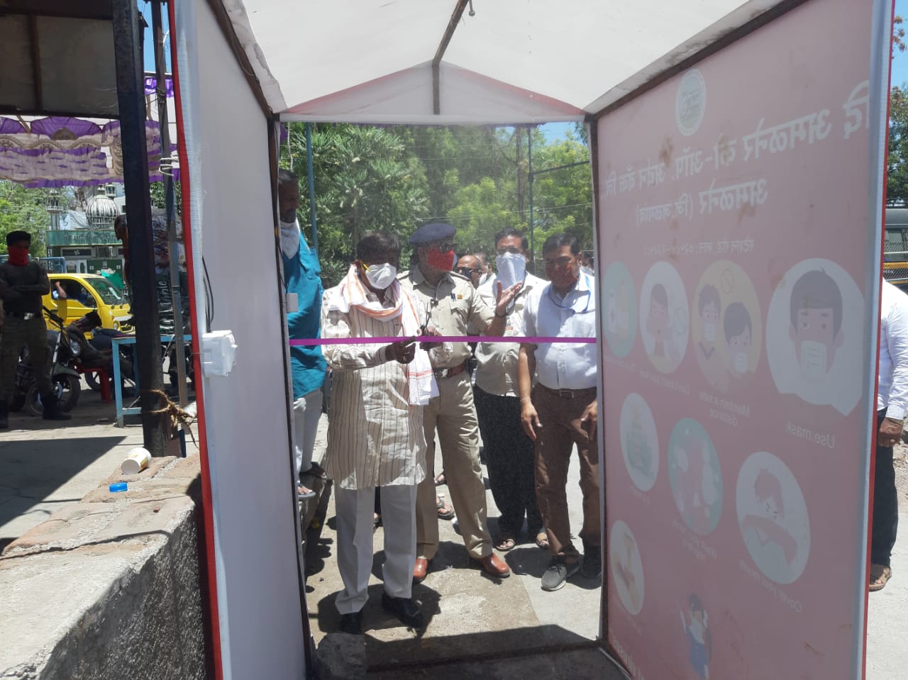 अमळनेर : कोरोनाच्या पार्श्वभूमीवर शहरातील झामी चौक, आमलेश्वर नगर इ. कॉन्टिनेंटल झोन (रेड झोन) म्हणून घोषित करण्यात आला आहे. त्या भागात जाण्यासाठी प्रशासनाकडून पन्नालाल चौक येथे एकच प्रवेश ठिकाण करण्यात आले आहे. दि अमळनेर अर्बन बँकेच्या सौजन्याने तज्ञ डॉक्टर व आरोग्य विभागाच्या मार्गदर्शनाने याठिकाणी निर्जंतुकीकरण प्रवेशद्वाराची निर्मिती करण्यात आली आहे. माजी आमदार साहेबराव पाटील यांचे उपस्थितीत या प्रवेशद्वाराचा नागरिकांसाठी आज प्रारंभ करण्यात आला. यावेळी पोलीस निरीक्षक अंबादास मोरे, बॅंकेचे चेअरमन पंकज मुंदडे, व्यवस्थापक अमृत आबा पाटील, संचालक लालू शेठ, शांताराम ठाकूर, प्रवीण जैन, प्रदीप अग्रवाल, अभिषेक पाटील, भरत ललवाणी, बाळासाहेब संदानशिव, पंकज चौधरी, कर्मचारी प्रवीण सातपुते, अवी जाधव, किरण बागुल, विक्रांत पाटील व सामाजिक कार्यकर्ते यांची उपस्थिती होती. अर्बन बँकेच्या सौजन्याने सुरु झालेल्या या कार्याचे मान्यवरांनी कौतुक करून आभार मानले.