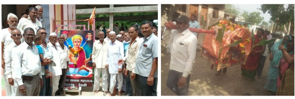 अमळनेर : तालुक्यातील देवगाव देवळी येथे कोरोना नियमांचे पालन करत संत शिरोमणी सावता माळी पुण्यतिथी भक्तीपूर्ण वातावरणात साजरी करण्यात आली. सरपंच सरलाबाई पुंडलिक पाटील व सामाजिक कार्यकर्ते पुंडलिक पाटील यांनी संत सावता महाराज यांच्या प्रतिमेचे सपत्नीक पूजन केले. त्यानंतर संत सावता महाराज यांच्या पालखीची मिरवणूक काढण्यात आली. दुपारी संपूर्ण गावाला सरपंच सरलाबाई पुंडलिक पाटील व उपसरपंच संदीप जगन्नाथ शिंदे यांनी स्वखर्चातून महाप्रसादाचा कार्यक्रम आयोजित केला होता. यावेळी ग्रामपंचायत सदस्य सुभाष बैसाणे, कल्पनाबाई चंद्रभान माळी, मंदा चंद्रकांत माळी, आनंद नगराज भिल, अनिता छोटू मोरे, वैशाली निलेश माळी, गोपाल सुदाम माळी यांनी सहकार्य केले.