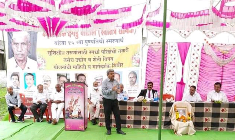 एरंडोल : तालुक्यातील आडगांव येथे कै.कौतिक दगडू पाटील (स्वातंत्र्य सैनिक) यांच्या १५ व्या पुण्यतिथी स्मरणार्थ गावातील तरुणांसाठी नुकतेच स्पर्धा परीक्षा, उद्योग व कृषी या विविध विषयांवर मार्गदर्शन शिबीर आयोजित करण्यात आले होते. यावेळी व्यासपीठावर प्रमुख पाहुणे म्हणून कोपरगावचे पोलीस अधिक्षक वासुदेव देसले, पुणे येथील उद्योजक महेंद्र पाटील, अमळनेर महिला महाविद्यालयाचे उपप्राचार्य प्रा.श्याम पवार, मुंबई येथील कस्टम ऑफिसर गोकुळ पाटील, निवृत्त कृषी अधिकारी सुधाकर पाटील, खेडी येथील आदर्श शेतकरी विलास शिंदे, खेडगाव येथील साळुंखे साहेब, निवृत्त शिक्षक मधुकर पाटील, पोलीस पाटील नितीन पाटील, स्पर्धा परिक्षेचे समन्वयक विजयसिंग पवार उपस्थित होते. सुरुवातीला कै.कौतिक दगडू पाटील (स्वातंत्र्य सैनिक) यांच्या प्रतिमेचे पूजन करण्यात आले. सर्व मान्यवरांनी तरुणांना स्पर्धा परिक्षा, उद्योग, शेतीविषयक योजनांची माहिती आदी विषयांवर बहुमोल मार्गदर्शन केले. कार्यक्रमाचे आयोजन एन.के.पाटील यांनी केले. यावेळी ग्रामस्थ व तरुण वर्ग मोठ्या संख्येने उपस्थित होते.