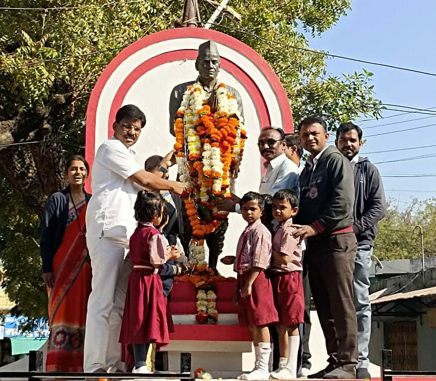 अमळनेर : पुज्य साने गुरुजी यांच्या जयंती चे औचित्य साधत येथील सरस्वती विद्या मंदिर शाळेचे मुख्याध्यापक रणजित शिंदे, शिक्षकवृंद, विद्यार्थी यांनी पुज्य साने गुरुजी कर्मभूमी स्मारक येथे भेट देऊन पुज्य साने गुरुजी यांच्या पुतळ्याला पुष्पहार अर्पण करून अभिवादन केले. यानंतर उपस्थित लेखक व सामाजिक कार्यकर्ते, मान्यवर यांचेसोबत हितगुज केले.