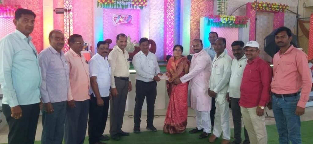 ग.स.पतपेढी तर्फे राजमाता जिजाऊ कन्यादान योजना अंतर्गत पाच हजार रुपयांचा धनादेश सुलोचना पाटील यांना देताना उमेश काटे. शेजारी ग.स.पतपेढीचे संचालक तथा गटशिक्षणाधिकारी विश्वासराव पाटील व पदाधिकारी