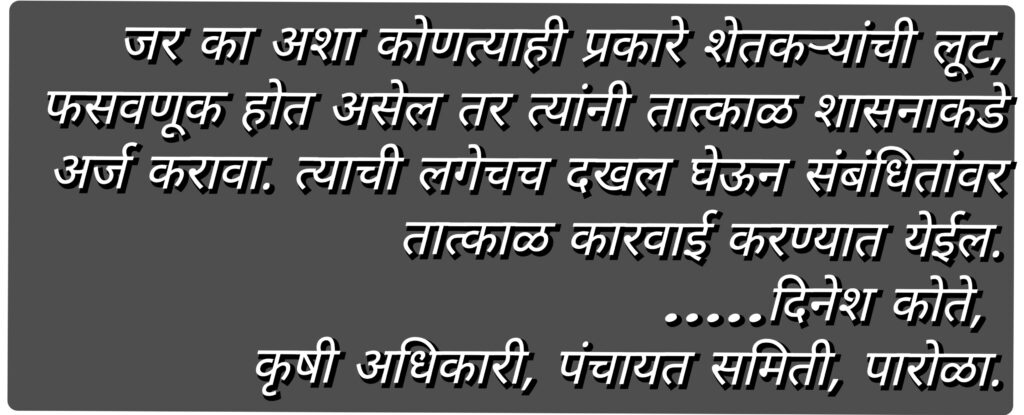 पारोळा शहर कृषी क्षेत्रातल्या बि बियाणे, रासायनिक खते, औषधी यासाठी खानदेशातील मोठी बाजारपेठ असून याचा फायदा हा शेतकऱ्यांना होणे अपेक्षित आहे. परंतु असे न होता शेतकऱ्यांची लूट सुरु आहे. यामुळे महाराष्ट्र शेतकरी संघटनेच्या माध्यमातून अचानक कृषी अधिकारी दिनेश कोते यांच्यासमवेत पारोळा शहरातील पाटील ऍग्रो, संदेश कृषी सेवा केंद्र, आनंद फर्टीलायझर, गायत्री कृषी सेवा केंद्र, संजय कृषी सेवा केंद्र या दुकानांना प्रत्यक्ष भेट देत शेतकऱ्यांचे अभिप्राय जाणून घेतले. बियाणे खरेदी करण्यासाठी आलेल्या शेतकऱ्यांशी संपर्क साधून पडताळणी करण्यात आली. चौकशी केली असता असे लक्षात आले की, शासन यंत्रणा या सर्व लॉबी च्या दावणीला बांधली आहे. कृषी अधिकारी समोर असतांना देखील स्टॉक लिहिलेले नव्हते. विचारले असता, न पटणारे उत्तरे देत होते. जर शासकीय अधिकारी यांनाही ही लॉबी जुमानत नसेल तर सर्व सामान्य शेतकऱ्याचे काय होत असावे ? शेतकऱ्यांची सरळ सरळ फसवणूक आणि लूट करताना दिसत आहेत. शासनाने कापसाच्या प्रती बँग ८५३ रुपये हा दर ठरवलेला असून पारोळा तालुक्यातील कृषी केंद्र संचालक हे काही विशिष्ट प्रकारच्या वाणांची बँग १२०० ते १५०० रुपये पर्यंत विक्री करताना दिसत आहेत. शेतकऱ्याला गरज असल्यामुळे कृषी केंद्र चालकांकडून शेतकऱ्यांची लुट होत आहे. कृषी केंद्र संचालकांनी शेतकऱ्यांची ही आर्थिक लूट व न चालणारे नको ते वाण देऊन त्याच्या शेतीच्या वार्षिक उत्पन्नामध्ये घट निर्माण करण्याचे कटकारस्थान कृषी संचालक करताना दिसत आहेत. यावर शासनाने गंभीर दाखल घ्यावी तसे न झाल्यास महाराष्ट्र शेतकरी संघटना शांत बसणार नाही. जर का अशीच लूट चालू राहिली तर या लोकांना संघटना त्यांची जागा दाखविल्या शिवाय राहणार नाही आणि याचे परिणाम खूपच गंभीर असतील असे मत महाराष्ट्र शेतकरी संघटनेचे संस्थापक अध्यक्ष तथा शेतकरी नेते सुनील देवरे यांनी व्यक्त केले. कृषी अधिकारी दिनेश कोते यांनी सांगितले की, जर का अशा कोणत्याही प्रकारे शेतकऱ्यांची लूट, फसवणूक होत असेल तर त्यांनी तात्काळ शासनाकडे अर्ज करावा. त्याची लगेचच दखल घेऊन संबंधितांवर तात्काळ कारवाई करण्यात येईल.