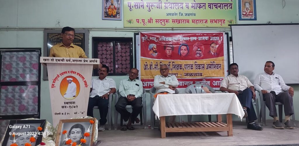 अमळनेर : ओ. बी. सी शिक्षक असोसिएशन ही पुरोगामी चळवळीत योगदान देणारी व विद्यार्थी, शिक्षक, पालक यांच्या समस्येला पर्याय देणारी संघटना आहे. या संघटनेचे संस्थापक विलास पाटील हे नुकतेच सेवानिवृत्त झाले. यानिमित्त जळगाव ओ.बी.सी. शिक्षक असोसिएशन मार्फत साने गुरूजी वाचनालयात कार्यक्रम घेण्यात आला. व्यासपीठावर अध्यक्षस्थानी प्रताप काॅलेज अमळनेरचे निवृत प्राचार्य एस.ओ. माळी तर प्रमुख अतिथी म्हणून साहित्यिक गोकुळ बागुल, विजय पवार, प्रकाश पाटील, बी. एस. जाधव व सत्कारमूर्ती विलासराव पाटील होते. सर्वप्रथम मान्यवरांच्या हस्ते महात्मा फुले व सावित्रीबाई फुले यांच्या प्रतिमेचे पूजन करण्यात आले. सर्व मान्यवरांचा सत्कार करण्यात आला.