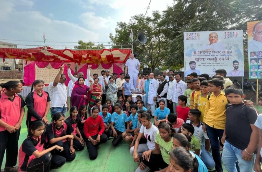 अमळनेर- राष्ट्रवादी काँग्रेस पक्षाचे अध्यक्ष मा.शरदचंद्र पवार यांच्या वाढदिवसानिमित्त मुलांना मैदानी खेळाकडे आकर्षित करण्यासाठी अमळनेरात खुल्या कबड्डी स्पर्धेचे आयोजन करण्यात आले होते. गलवाडे रोडवर ग्लोबल इंग्लिश स्कूल जवळील मैदानात दिनांक १६ डिसेंबर रोजी या स्पर्धा आयोजित करण्यात आल्या होत्या. सकाळी मान्यवरांच्या हस्ते या स्पर्धेचे उद्घाटन करण्यात आले. यावेळी माजी मंत्री डॉ सतीश पाटील, राष्ट्रवादीचे जिल्हाध्यक्ष रविंद्र भैय्या पाटील, माजी आमदार डॉ. बी. एस. पाटील, जेष्ठ नेत्या सौ. तिलोत्तमा पाटील, ग्रंथालय सेल प्रदेशाध्यक्ष उन्मेष पाटील, प्रदेश समन्वयक सौ. रिता बाविस्कर, शिक्षक सेलचे जिल्हाध्यक्ष दयाराम पाटील, कमलबाई पाटील, डॉ. किरण पाटील, अरुण शिंदे, लतीब मिस्तरी, रफिक शेख, सतीश देशमुख आदी उपस्थित होते.