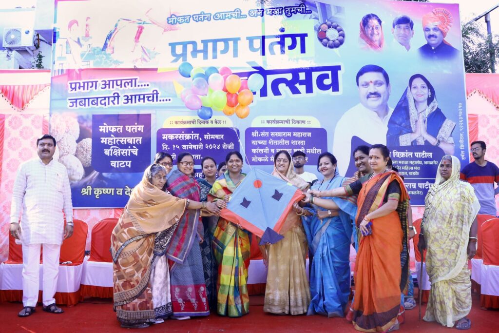 अमळनेर : सालाबादाप्रमाणे येथील श्रीकृष्णपुरा, वड चौक, सावतावाडी, शारदा कॉलनी, श्रीराम कॉलनी, शिवाजीनगर व परिसरातील नागरिक, बाळ गोपाळ व महिला मंडळींसाठी खास मकर संक्रांती निमीत्ताने माजी नगरसेवक विक्रांत पाटील व सौ. स्वप्ना पाटील यांनी माझा प्रभाग पतंग महोत्सवाचे आयोजन केले होते. माजी आमदार श्रीमती स्मिता वाघ यांचे हस्ते फुगे व पतंग हवेत सोडून पतंग महोत्सवाचे उद्घाटन करण्यात आले. श्री संत सखाराम महाराज यांच्या शेतातील शारदा कॉलनी व वाडीतील मैदानात पतंग महोत्सव भरविण्यात आला होता. उपस्थित सर्वांना मोफत पतंग वाटप करण्यात आले. सर्वाँनी उत्साहपुर्ण वातावरणात पतंग उडवून डी. जे. च्या तालावर नाचत आनंद द्विगुणित केला.