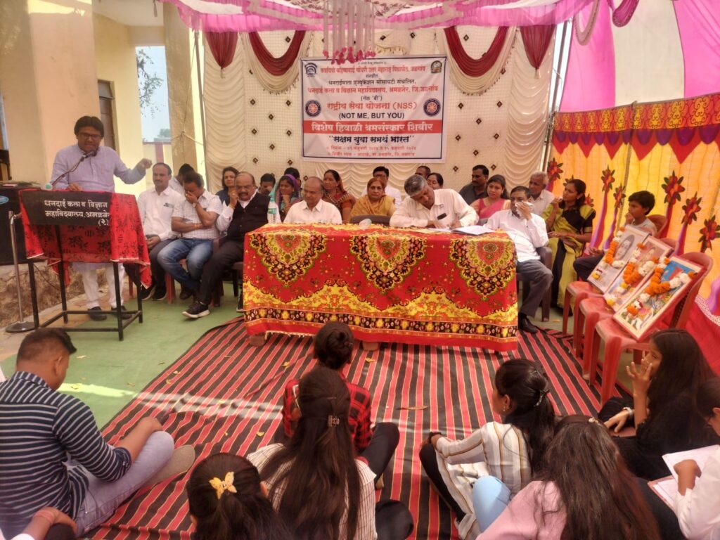 अमळनेर : धनदाई महाविद्यालयाच्या राष्ट्रीय सेवा योजना (NSS) अंतर्गत सात दिवसीय विशेष हिवाळी श्रमसंस्कार शिबिर दिनांक ९ फेब्रुवारी ते १५ फेब्रुवारी २०२४ काळात अमळनेर तालुक्यातील मौजे आटाळे येथे झाले. शिबिराचे उद्घाटन माजी सैनिक अनिल बाविस्कर यांच्या हस्ते ९ फेब्रुवारीला झाले. या शिबिरात एकूण ७५ स्वयंसेवक विद्यार्थ्यांनी सहभाग घेतला. सात दिवसाच्या कालावधीत विद्यार्थी हे आटाळे गावातील जिल्हा परिषद शाळेत निवासी होते. विद्यार्थ्यासोबत प्रा. महादेव तोंडे (कार्यक्रमाधिकारी), डॉ. संगीता चंद्राकर (महिला कार्यक्रमाधिकारी), व उपप्राचार्य डॉ. लिलाधर पाटील (सहाय्यक कार्यक्रमाधिकारी) यांनी काम केले. या कालावधीत विद्यार्थ्यांनी अनेक समाज उपयोगी कामे केली. त्यात आटाळे गावच्या जिल्हा परिषद शाळेच्या परिसराची स्वच्छता करुन झाडांना आळे करणे, झाडांना पाणी टाकणे, नवीन झाडे लावण्यासाठी ५० खड्डे खोदणे, गावातील सर्व रस्ते झाडून स्वच्छ करणे, नाल्या साफ करणे आणि गावातील हनुमान मंदिर, महादेव मंदिराची स्वच्छता करणे आदी कामे केली. गावात जनजागृती रॅली काढत विद्यार्थ्यांनी पथनाट्य सादर केले. यातून पर्यावरण संवर्धन, व्यसनमुक्ती, बेटी बचाव बेटी पढाव याविषयी जनजागृती करण्याचे काम विद्यार्थ्यांनी केले.