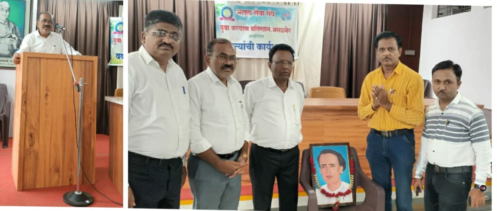 अमळनेर : येथील धनदाई महाविद्यालया च्या यशवंत सभागृहात मराठा सेवा संघ व युवा कल्याण प्रतिष्ठान तर्फे नुकतीच दिनांक २७ जुलै रोजी अण्णाभाऊ साठे जयंतीच्या पार्श्वभूमीवर वक्त्यांची कार्यशाळा भरविण्यात आली. विचार मंचावर युवा कल्याण प्रतिष्ठानचे अध्यक्ष प्रा. अशोक पवार, कार्यक्रमाचे उद्घाटक व्हॉइस ऑफ मीडिया साप्ताहिक विंग चे जिल्हाध्यक्ष संजय सूर्यवंशी, मार्गदर्शक प्रा. डॉ. राहुल निकम उपस्थित होते. सुरुवातीला मान्यवरांच्या हस्ते अण्णाभाऊ साठे यांच्या प्रतिमेचे पूजन करण्यात आले. प्रा. अशोक पवार यांनी प्रास्ताविक केले. यानंतर युवा कल्याण प्रतिष्ठान च्या वतीने संजय सूर्यवंशी यांना व्हॉईस ऑफ मीडिया साप्ताहिक विंग चे जिल्हाध्यक्ष पदी नियुक्ती झाल्याबद्दल शाल व भेटवस्तू देऊन सत्कार करण्यात आला.