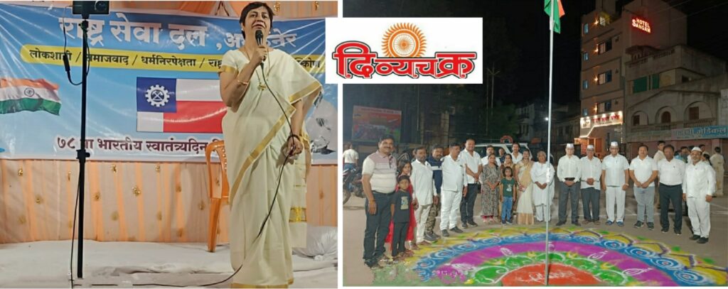 अमळनेर : येथील सुभाष चौकात राष्ट्र सेवा दलाच्या वतीने १५ ऑगस्ट रोजी सकाळी ठीक १२:०१ वाजता म्हणजेच १४ ऑगस्टला मध्यरात्री स्वातंत्र्य दिनाच्या प्रथम घडीला ध्वजारोहणाचा कार्यक्रम संपन्न झाला. फिनिक्स सोशल अवेअरनेस गृपच्या व जिजाऊ बहुउद्देशीय शैक्षणिक संस्थेच्या अध्यक्षा ॲड. ललिता पाटील यांच्या हस्ते ध्वजारोहण करण्यात आले.