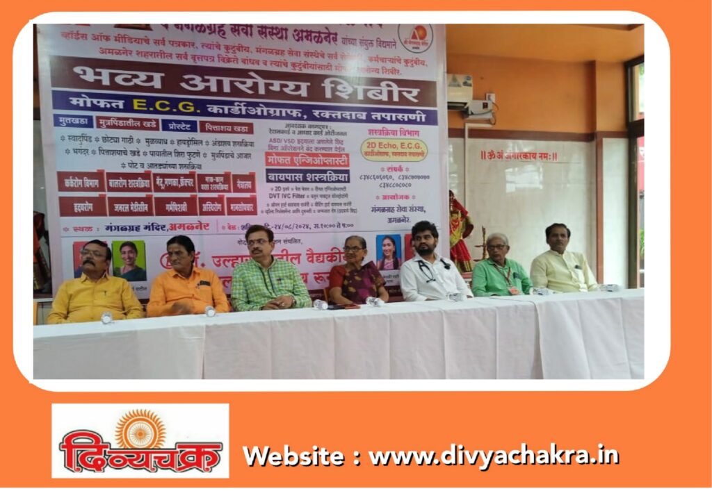 अमळनेर : येथील मंगळ ग्रह सेवा संस्था व गोदावरी फाऊंडेशन जळगाव यांच्या संयुक्त विद्यमाने व्हाॅईस ऑफ मीडियाचे सर्व पत्रकार, मंगळग्रह सेवा संस्थेचे सर्व सेवेकरी कर्मचारी, अमळनेर शहरातील सर्व वृत्तपत्र विक्रेते बांधव यांच्या कुटुंबीयांसाठी शनिवार, दिनांक २४ ऑगस्ट रोजी मंगळ ग्रह मंदिर येथे मोफत आरोग्य तपासणी शिबिराचे आयोजन करण्यात आले होते. मंचावर मंगळ ग्रह सेवा संस्थेचे अध्यक्ष डॉ. डिगंबर महाले, जयश्री साबे, उज्ज्वला शहा, उपाध्यक्ष एस. एन. पाटील, सचिव सुरेश बी. बाविस्कर, सहसचिव दिलीप बहिरम, विश्वस्त अनिल अहिरराव, डी. ए. सोनवणे, प्रकाश मेखा, व्हॉईस ऑफ मीडिया साप्ताहिक विंग चे जिल्हाध्यक्ष संजय सूर्यवंशी, व्हॉईस ऑफ मीडियाचे तालुकाध्यक्ष उमेश काटे आदी उपस्थित होते. सर्वप्रथम शिबिराचे उद्घाटन मंगळ ग्रह सेवा संस्थेचे अध्यक्ष डॉ. डिगंबर महाले, गोदावरी फाउंडेशनचे डॉ. दिनेश चौधरी, डॉ. ओमप्रकाश काकडे, डॉ. शुभम कॉलरा, डॉ. सुमित भोसले, डॉ. तेजस सोनवणे, डॉ. कुशल धांडे, डॉ. अभिलाश मोवाळे, डॉ. जान्हवी मापारी, डॉ. अजय राख, डॉ. तुषार चले यांच्या हस्ते दीप प्रज्वलन करुन झाले. मंगळग्रह संस्थेतर्फे गोदावरी फाऊंडेशन कडून आलेल्या सर्व टीम चा यथोचित सत्कार करण्यात आला.