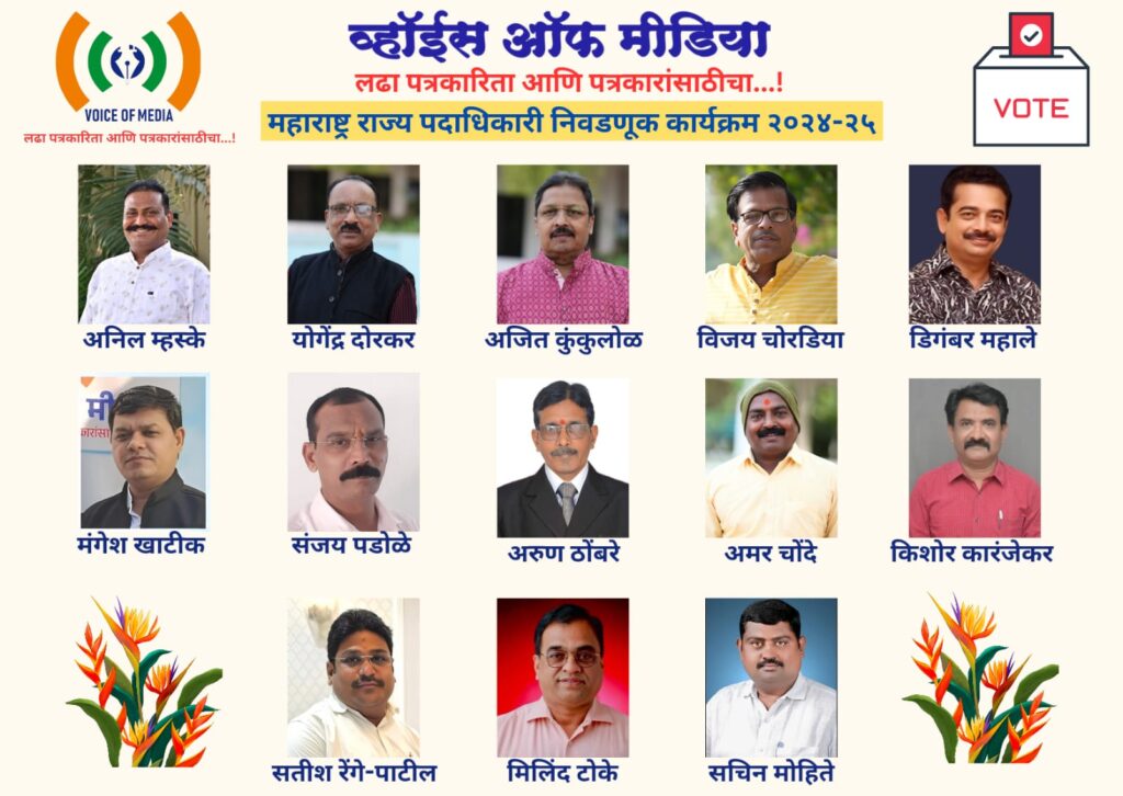 व्हॉईस ऑफ मीडियातील राज्य कार्यकारिणीच्या १३ पदांसाठी १३ उमेदवार रिंगणात आहेत. यात, अनिल मस्के, योगेंद्र दोरकर, अजित कुंकुलोळ, विजय चोरडिया, डिगंबर महाले, मंगेश खाटीक, संजय पडोळे, अरुण ठोंबरे, अमर चौंदे, किशोर कारंजेकर, सतीश रेंगे – पाटील, मिलींद टोके, सचिन मोहिते या उमेदवारांचा समावेश आहे. दिव्यचक्र परिवारातर्फे सर्व उमेदवारांना मनःपूर्वक शुभेच्छा..!