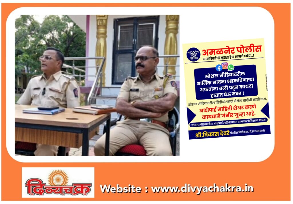 सोशल मीडियावरील फोटो, व्हिडिओ, मेसेज आदी बाबत खात्री करा. सोशल मीडियावर धार्मिक भावना भडकविणाऱ्या अफवांना बळी पडून कायदा हातात घेऊ नका. आक्षेपार्ह माहिती शेअर करणे कायद्याने गुन्हा आहे. सोशल मीडिया वरील आक्षेपार्ह माहितीबाबत तात्काळ पोलीसांना कळवा असे पोलीस प्रशासनाच्या वतीने अमळनेेर शहर पोलीस निरीक्षक विकास देवरे यांनी जनतेला आवाहन केले आहे.