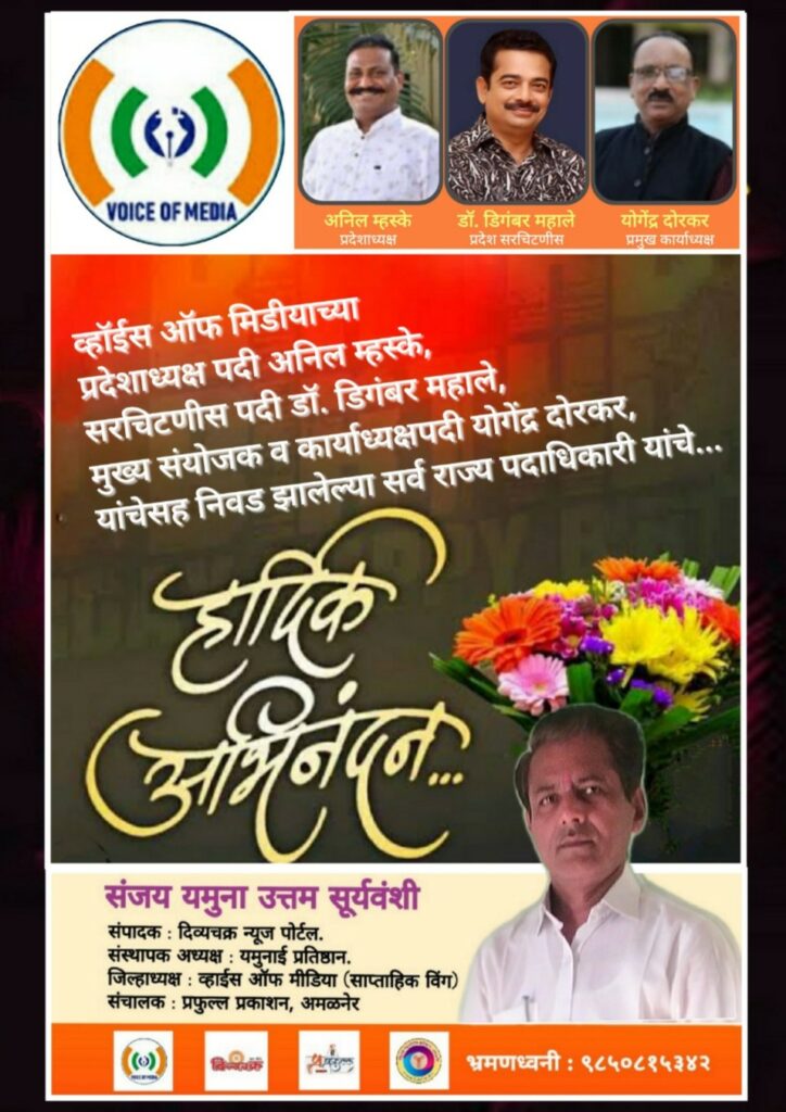 मुंबई : जागतिक पातळीवर ४३ देशात पत्रकार आणि पत्रकारांसाठी काम करणाऱ्या ३ लाख ९० हजार सदस्य संख्या असणाऱ्या व्हॉईस ऑफ मीडियाची महाराष्ट्र राज्य पदाधिकारी निवड प्रक्रिया निवडणुकी द्वारे नुकतीच पार पडली. या निवड प्रक्रियेमध्ये बुलढाण्याचे अनिल मस्के यांची प्रदेशाध्यक्ष म्हणून निवडणुकीच्या माध्यमातून निवड झाली. तर अमळनेेर (जळगाव) चे डॉ. डिगंबर महाले यांची सरचिटणीस म्हणून वर्णी लागली. कार्याध्यक्षपदी नंदुरबारचे योगेंद्र दोरकर, परभणीचे विजय चोरडिया आणि चंद्रपूरचे मंगेश खाटीक, उपाध्यक्ष म्हणून सोलापूरचे अजित कुंकुलोळ यांना प्रचंड मताधिक्य मिळवून त्यांची निवड झाली.