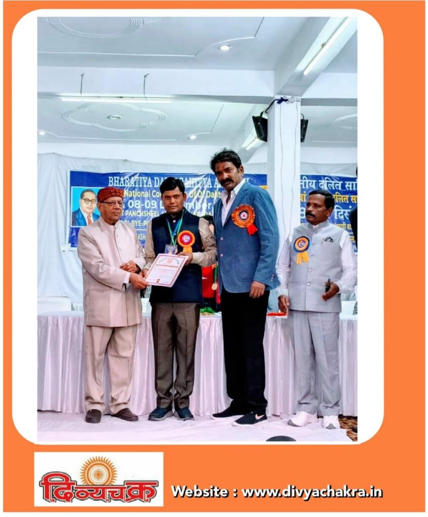 दिल्ली येथील ‘भारतीय दलित साहित्य अकॅडमी’ ही संस्था सामाजिक, शैक्षणिक, आर्थिक, साहित्य, राष्ट्रीय एकात्मता, प्रबोधनात्मक काम करणाऱ्यांना तसेच दलित व वंचित घटकांसाठी झिजणाऱ्या व्यक्तींना फेलोशिप देत असते. आजपर्यंत त्यांनी विविध राज्यातून आलेल्या कर्तुत्ववान लोकांना पुरस्कार दिलेले आहेत. दिल्ली येथे पार पडलेल्या या कार्यक्रमास माजी मंत्री संघप्रिय गौतमजी हे उपस्थित होते. त्यांना डॉ. बाबासाहेब आंबेडकरांच्या सोबत काम करण्याचा अनुभव आहे. त्यांनी समाजाशी एकरूप होऊन घनिष्ठ नाळ जोडून ठेवलेली आहे. विविध सामाजिक कार्यात करण्याचा त्यांचा हातखंडा आहे. याप्रसंगी भारतीय दलित साहित्य अकॅडमीचे राष्ट्रीय अध्यक्ष एस. पी. सुमनाक्षर, राष्ट्रीय सचिव जय सुमनाक्षर, प्रोफेसर रतनलाल सोनाग्रा तसेच अनेक आजी, माजी मंत्री कार्यक्रमासाठी उपस्थित होते. अजय भामरे यांना दिल्ली येथील ‘महात्मा ज्योतिबा फुले फेलोशिप राष्ट्रीय अवार्ड- २०२४’ मिळाल्याबद्दल त्यांचे समाजातील सर्व स्तरातून अभिनंदन व कौतुक होत आहे. दिव्यचक्र परिवारातर्फे अभिनंदन..!