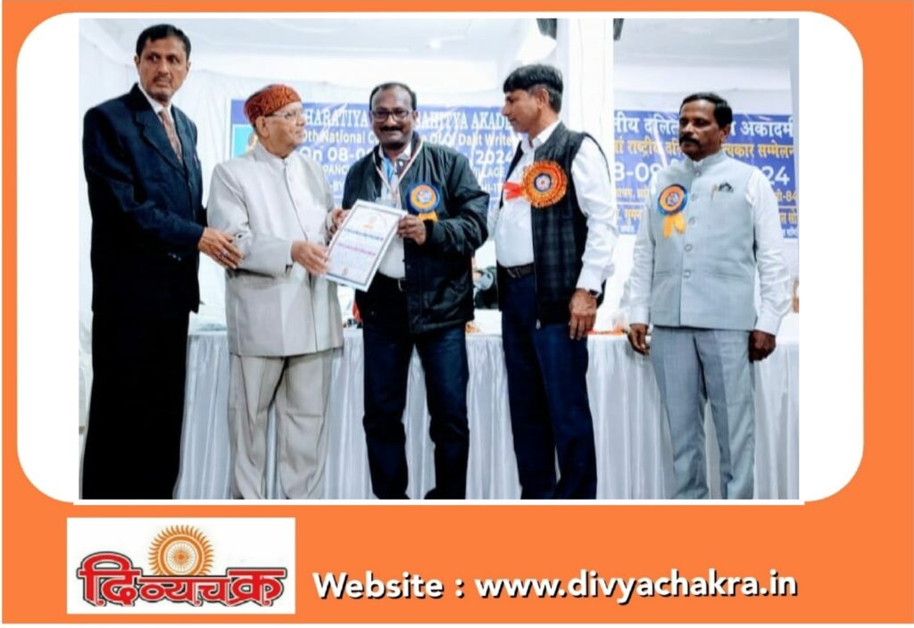अमळनेर : अखिल भारतीय साहित्य अकादमी, दिल्ली चे ४० वे राष्ट्रीय संमेलन दि. ८ व ९ डिसेंबर २०२४ रोजी नवी दिल्ली येथे पार पडले. देशातील प्रत्येक राज्यातील विविध क्षेत्रात उत्कृष्ट कार्य करणाऱ्या व्यक्तींना पुरस्कार देऊन संमेलनात गौरविण्यात येते. दिल्ली येथील अखिल भारतीय साहित्य अकादमीने अमळनेेर येथील पत्रकार प्रा. डॉ. विजय गाढे यांच्या सामाजिक कार्याची दखल घेत खान्देशातून ‘डॉ. बाबासाहेब आंबेडकर राष्ट्रीय फेलोशिप -२०२४’ पुरस्कार देऊन उपस्थित मान्यवरांच्या हस्ते नुकतेच सन्मानित करण्यात आले. गौरवपत्र, सुवर्ण पदक, स्मृतिचिन्ह असे पुरस्काराचे स्वरूप आहे. यावेळी मंचावर राष्ट्रीय अध्यक्ष डॉ. एस. पी. सुमनाक्षर, राष्ट्रीय महासचिव जय सुमनाक्षर, प्रोफेसर रतन लाल सोनागरा (अध्यक्ष स्वागत समिती), तसेच डॉ. बाबासाहेब आंबेडकर यांचे सहकारी तथा माजी मंत्री संघप्रिय गौतमजी यांसह अनेक आजी, माजी मंत्री उपस्थित होते.