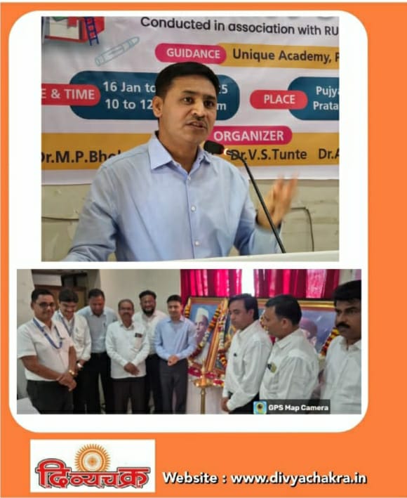 अमळनेर : खानदेश शिक्षण मंडळ संचलित प्रताप महाविद्यालय (स्वायत्त) अमळनेर येथील अंतर्गत गुणवत्ता अभिवचन कक्ष (IQAC), राष्ट्रीय उच्चतर शिक्षा अभियान (RUSA), करियर कौन्सिलिंग सेंटर (CCMC) यांच्या संयुक्त विद्यमाने आयोजित स्पर्धा परीक्षा मार्गदर्शन कोर्सच्या निमित्ताने प्रमुख मार्गदर्शक म्हणून द युनिक अकॅडमी, पुणेचे संस्थापक तुकाराम जाधव उपस्थित होते. त्यांनी विद्यार्थ्यांना करिअर संबंधी मार्गदर्शन केले. कार्यक्रमाचे अध्यक्षस्थानी संस्थेचे सहचिटणीस डॉ. धिरज वैष्णव होते. यावेळी मंचावर उपप्राचार्य डॉ. विजय तुंटे, डॉ. व्ही. बी. मांटे, डॉ. अमित पाटील, रुसा समन्वयक डॉ.मुकेश भोळे, प्रा. डॉ.रवींद्र माळी, अशोक बिऱ्हाडे, डॉ. जितेंद्र पाटील उपस्थित होते.