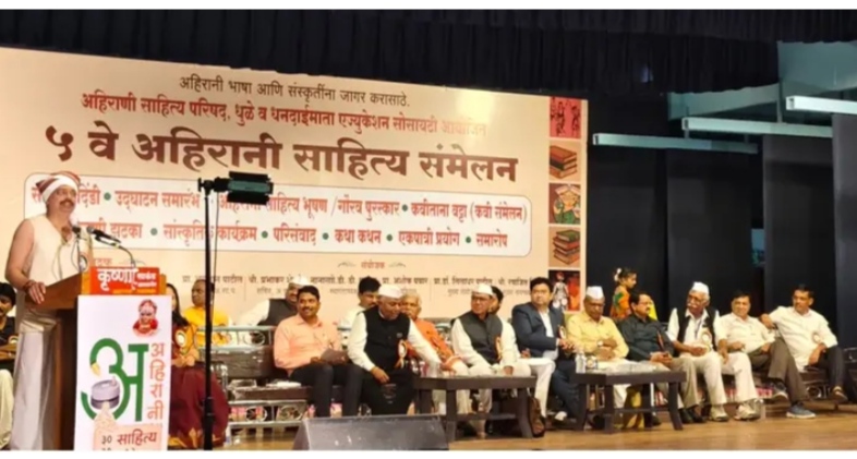अमयनेर : परत्येक भाषासनी काही तरी खास बात ऱ्हास. खान्देशमा सुख राहो का दुख राहो, परत्येक येयले ‘माय’ हाऊ शबद वापरमा येस म्हणून अहिराणीले मायबोली म्हणतस. मातर अहिराणी भाषाइषयी गैरसमज व्हयेलमुये आमले बोलताना कमीपणा वाटाले लागस. कायबी करा, पण आपली मायबोली अहिराणी भाषाले वाचाडा, अशी आशा संमेलनना उद्घाटक ज्येष्ठ पत्रकार अन् मंगळग्रह सेवा संस्थाना अध्यक्ष डॉ. डिगंबर महाले यासनी छत्रपती शिवाजी राजासन नाव लेत अमळनेरमा सुरू व्हयेल पाचवं अहिराणी साहित्य संमेलनना उद्धाटन ना टाईमले करी. अहिराणी भाषाना जागर व्हवाले पाह्यजे या उद्देशथून आयोजित करेल पाचवं अहिराणी साहित्य संमेलननं उद्धाटन ३० मार्च ले अहिराणी सेवक साथी गुलाबराव पाटील साहित्य नगरी, छत्रपती शिवाजी महाराज नाट्यगृहामा झाय. तव्हय त्या बोली ऱ्हायनतूत. खानदेशनं दैवत कानबाईनी पूजा करीसनी उद्घाटन झाय. स्वर्गीय गुलाब बापूसनी कोपरीनी पुर्नआठवण म्हणीसन आंगमा कोपरी, धोती असा पेहराव करीसन व्यासपीठवर एक एगळीच एंट्री करी. ‘साला मैं तो साब बन गया…’ म्हणत गुलाब बापूसन्या आठवणी जाग्या कयात. तव्हय कार्यक्रमना अध्यक्ष अहिराणी भाषाना अभ्यासक व सुप्रसिद्ध लेखक डॉ. रमेश सूर्यवंशी, आमदार अनिल पाटील, महाराष्ट्र राज्य विश्वकोष निर्मिती मंडयना सचिव डॉ. शामकांत देवरे, धनदाई माता एज्यूकेशन सोसायटीना अध्यक्ष डी. डी. पाटील या मान्यवर व्यासपीठवर उपस्थित व्हतात.