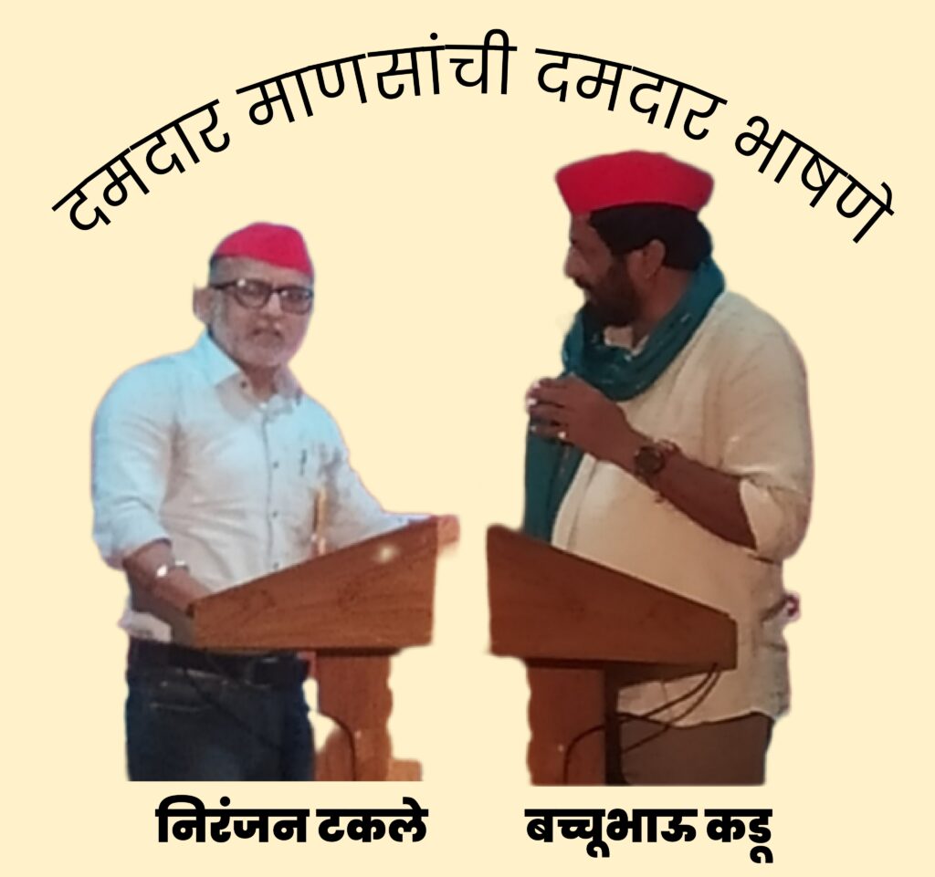 प्रहार जनशक्ती पक्षाचे अध्यक्ष बच्चुभाऊ कडू यांनी सरकारवर प्रहार करताना शेतकरी, गोरगरीब, अनाथ, दिव्यांग जनतेच्या व्यथा मांडल्या. दुष्काळ पडल्या नंतर कर्ज माफ करु असे म्हणणारे मुख्यमंत्री आज ओला दुष्काळ पडूनही काही बोलायला तयार नाहीत. ज्या शेतकऱ्यांच्या मतावर आमदार खासदार निवडून येतात त्यांच्यावरच सर्वात जास्त अन्याय होत आहे. शेतकऱ्यांच्या आंदोलना पेक्षा गावातील गणपती बसवायला जास्त लोक एकत्र येतात, एवढी उदासीनता आज समाजात आहे. हे सांगताना आता कुणासाठी लढावं.. अशी अवस्था निर्माण झाली आहे.. कधी कधी पश्चात्ताप येतो. दु:ख वाटते.. ज्यांचे साठी लढावं तेच पेटून उठत नाही अशी खंत व्यक्त केली. जाती धर्माच्या नावाखाली सारं काही चाललं आहे. व्यवस्था कां अशी होते..? कुठे आहेत संवेदना..? जात, पात, धर्म, राजकीय गुलाम ही मोठी समस्या आहे. मतांची नव्हे तर समाजमनाची चोरी होते आहे. माणूस मानसिक गुलामीत जीवन जगतो. सत्ता महत्वाची वाटते.. गावागावात राजकीय गुलाम झाले असून इतके निष्ठावंत आहेत की, बाप मेला तरी चालेल पण नेत्याला काही बोलायच नाही अशी भूमिका घेणारे निष्ठावंत शेतकऱ्यांसाठी घातक ठरत आहेत. यामुळे शेतकऱ्यांची लढाई मोठी होत नाही. कोणताही झेंडा हाती असावा पण.. प्रगतीच्या आड येणारा नसावा. समाजमन मेलं आहे. ब्रेकिंग काय हेच लक्षात येत नाही.. घराघरात बॉम्ब टाकला जात असून येणाऱ्या पिढीला ते घातक आहे. मतदार हा आत्मा असून चिंतन करण्याची गरज असल्याचे त्यांनी सांगितले.