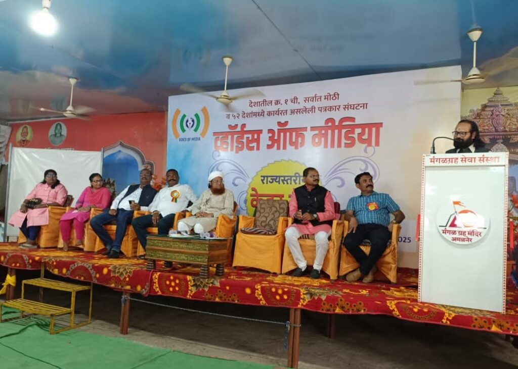 अमळनेर : ‘माझा शब्द.. माझा ईमान मला विकायचा नाही असा विश्वास ठेऊन पत्रकारिता करायला हवी. अशा पत्रकारितेला मीडियात अनन्य साधारण महत्त्व आहे. पत्रकाराची लेखणी सामाजिक सलोख्यासाठी कारणी लागली पाहिजे. ती जबाबदारी आपल्यावरच आहे’ असे मत ज्येष्ठ पत्रकार विश्वास देवकर यांनी व्यक्त केले. अमळनेर येथील श्री मंगळ ग्रह मंदिर येथे व्हॉईस ऑफ मीडिया आणि व्ही.ओ.एम. इंटरनॅशनल फोरम तर्फे आयोजित राज्यस्तरीय केडर कॅम्प २०२५ मध्ये मार्गदर्शन करताना ते बोलत होते. यावेळी मंचावर व्हॉईस ऑफ मीडियाचे प्रदेशाध्यक्ष अनिल म्हस्के, उर्दू विंगचे राष्ट्रीय अध्यक्ष नदवी, कोअर टीमचे पदाधिकारी उपस्थित होते.