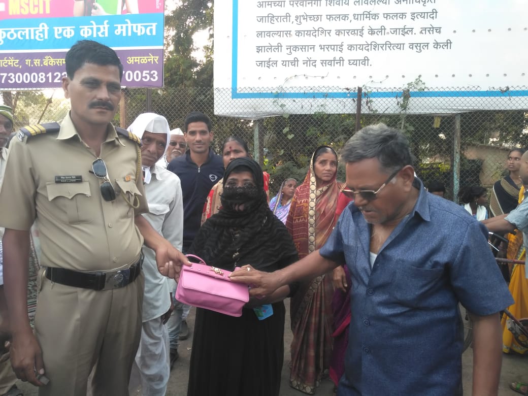 याबाबत समजलेली माहिती अशी की, मालेगाव येथील नजमाबी नसीर खान अमळनेर बस स्थानकात होत्या. दुपारी सुमारे चार वाजेच्या सुमारास बस स्थानकावर हवालदार निंबा शिंदे त्यांचेसोबत असलेले होमगार्ड भूषण शिंदे यांना लेडीज पर्स सापडली. त्यांनी उपस्थित प्रवाशांना पर्सविषयी विचारपुस केली. विचारपुस करत असतांना समोरून एक मुस्लिम महिला आली व पोलीस हवालदार निंबा शिंदे यांना पर्स हरवली असल्याची माहिती दिली. यावर हवालदार शिंदेंनी त्यांना पर्सचा रंग कोणता ? पर्समध्ये काय वस्तू होत्या ? याबाबत शहानिशा केली. यावर सदर महिलेने गुलाबी रंगाची पर्स असून त्यात दागदागिने असल्याचे सांगितले. पर्स शोधून त्यात दीड ते दोन लाख रुपये किंमतीचे दागदागिने सापडले. सदर महिलेची खात्री पटल्यानंतर हवालदार शिंदे यांनी सदर महिलेला दागिन्यांसह पर्स परत केली. हवालदार शिंदे यांचे सर्वत्र अभिनंदन होत आहे.