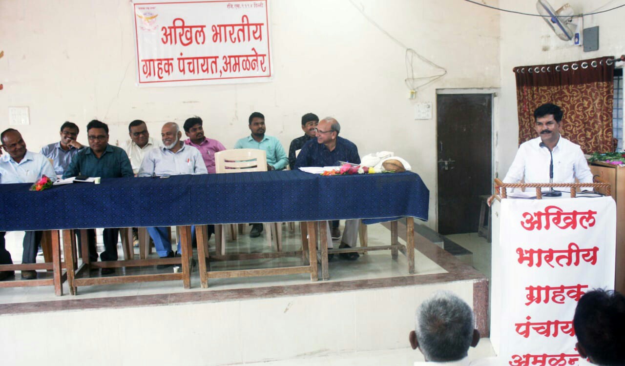 अमळनेर : येथील जी.एस.हायस्कूल मधील आय.एम.ए. हॉलमध्ये अखिल भारतीय ग्राहक पंचायत तर्फे आज रोजी वीज ग्राहकांसाठी मार्गदर्शन कार्यशाळा महावितरण धरणगाव विभागाचे कार्यकारी अभियंता रमेश पवार यांच्या उपस्थितीत संपन्न झाली. कार्यशाळेचे अध्यक्ष म्हणून मकसूदभाई बोहरी होते. याप्रसंगी व्यासपीठावर सेवानिवृत्त जिल्हा न्यायाधीश गुलाबराव पाटील, अमळनेर एम.आय.डी.सी. चेअरमन जगदीशभाऊ चौधरी, अमळनेर महावितरणचे अभियंता कोलते साहेब, देशमुख साहेब, फुरसिंगे साहेब आदी मान्यवर उपस्थित होते. संघटनेतर्फे यावेळी मान्यवरांचा यथोचित सत्कार करण्यात आला. भाजपाचे माजी जिल्हाध्यक्ष उदय वाघ यांना भावपूर्ण आदरांजली वाहण्यात आली.