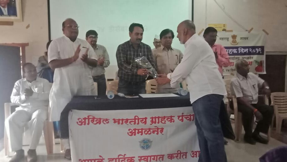 अमळनेर : महाराष्ट्र शासन व अखिल भारतीय ग्राहक पंचायत, अमळनेर यांच्या संयुक्त विद्यमाने आज ता.२४ रोजी ३३ वा राष्ट्रीय ग्राहक दिन संपन्न झाला. येथील गंगाराम सखाराम हायस्कूल मधील आय.एम.ए हॉलमध्ये कार्यक्रम झाला. राज्य ग्राहक संरक्षण परिषदेचे सदस्य तथा जिल्हाध्यक्ष विकास महाजन कार्यक्रमाचे उद्घाटक होते. अमळनेरचे तहसीलदार मिलिंद वाघ कार्यक्रमाच्या अध्यक्षस्थानी होते. याप्रसंगी प्रमुख पाहुणे म्हणून सेवानिवृत्त जिल्हा न्यायाधिश गुलाबराव बापू पाटील, जी.एस.हायस्कूलचे चेअरमन योगेश मुंदडा, पुरवठा अधिकारी संतोष बावणे, वजनमाप अधिकारी कुवरसिंग राजपूत, दिशा गॅस एजन्सीचे दिनेश रेजा व पारख एजन्सीचे रितेश पारख, अशासकीय सदस्य सतीश देशमुख, अंमळनेर ग्राहक पंचायतीचे संस्थापक अध्यक्ष ॲड.मनोहर शेठ भांडारकर, ऊर्जा मित्र सुनील वाघ आणि मान्यवर उपस्थित होते. तालुकाध्यक्ष मकसूद भाई बोहरी यांनी मान्यवरांचे स्वागत केले.